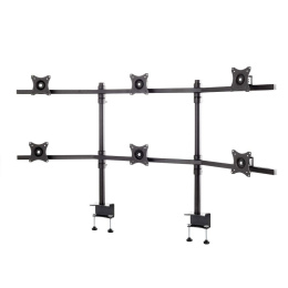 Stolní držák na 6 monitorů Edbak SV17 Stolní držák na 6 monitorů nebo televizorů s úhlopříčkou 17"-27", parabola, plně nastavitelné pozice monitorů, profesionální kvalita, VESA standardy 75x75 a 100x100, barva černá, nosnost 60kg Profesionální parabolický stolní držák na 6 monitorů 17-27". Nastavitelná poloha každého monitoru dle potřeby: otáčení do stran, naklápění, korekce roviny, pivot, posun do stran. Nastavení potřebné výšky vodorovných nosníků s monitory. V balení najdete 2 typy stolních úchytů: svěráky na uchycení na okraje stolů nebo šroubovici pro uchycení do průchodek. Systém vedení kabeláže. Nejvyšší kvalita, silnostěnný materiál. Podpora VESA standardů 75x75 a 100x100, barevné provedení černé, nosnost 60kg. Záruka 10 let. Profesionální stolní držák na 6 monitorů v parabole Edbak SV17 Technické údaje: nosnost 60kg na monitory s úhlopříčkou 17" až 27" VESA standardy 75x75mm a 100x100mm polohování vzdálenosti monitorů mezi sebou 223mm nastavení sklonu +/- 50° otáčení monitoru do stran +/-45° funkce pivot uchycení na stolové desky o síle 10-55mm (průchodka) nebo 10-80mm na okraj stolu nejvyšší kvalita, silnostěnný materiál, profesionální výrobek velmi snadná a rychlá montáž barva černá záruka 10 let Držák na 6 monitorů displejů Edbak SV17 Stojan na 6 monitorů Edbak SV17 podporuje VESA standardy: VESA 75x75 VESA 100x100 možnost zakoupení rozšíření na VESA 200x100 a 100x200 možnost zakoupení rozšíření na VESA 200x200.