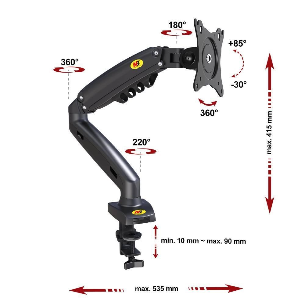 Stolní kancelářský držák monitoru NB F80B Profesionální držák monitorů 17-30", plně nastavitelný, krásný design, VESA 75x75 a 100x100, výškové polohování, nosnost 9kg Vynikající stolní držák na monitory, případně menší televize 17-30" v profesionální kvalitě, krásném designu a s mnoha nadstandartními možnostmi nastavení. Otáčení obrazovky do stran, náklon nahoru i dolů ve velkém rozmezí, nastavení vzdálenosti od uchycení až 535mm, korekce roviny obrazovky, horizontální nebo vertikální otočení obrazovky pivot, systém pro skryté vedení kabeláže. Výškové nastavení obrazovky v rozmezí až 260mm díky plynovému pístu - velmi snadná změna výšky pouhým stlačením nebo vytlačením monitoru. To vše v unikátním designu. Držák má velmi odolnou a bezpečnou konstrukci a je vhodný i do velmi vytížených provozů, kde je potřeba neustálé manipulace s monitorem. Stolní držák monitoru do kanceláře, provozovny nebo domácnosti - držák NB F80B Technické údaje: nosnost 9kg (minimální hmotnost obrazovky 2kg) podporuje VESA standarty 75x75 a 100x100 doporučujeme na monitory a televizory s úhlopříčkou 17" až 30" otáčení na obě strany +135° až -135° výšková regulace v rozmezí 260mm maximální výška 415mm velká úhlová nastavitelnost náklonu +85° až -30° regulace vzdálenosti od uchycení na stole 0mm až 535mm horizontální i vertikální otočení obrazovky funkcí pivot korekce roviny obrazovky velmi snadná nastavitelnost pouhou jednou rukou systém pro skryté vedení kabeláže profesionální držák vysoké kvality, odolná a bezpečná konstrukce vhodný i pro každodenní polohování monitoru 2 typy uchycení na stolovou desku (na okraj nebo do prostoru přes otvor) záruka 3 roky Stolní držák na monitor s plným polohováním NB F80B Kancelářský stolní držák NB F80B podporuje VESA standardy: VESA 75x75 VESA 100x100 možnost rozšíření na 200x100 za příplatek možnost rozšíření na 200x200 za příplatek Stolní držák do kanceláří v nejvyšší kvalitě a krásném designu, široká škála polohování NB F80B Díky profesionální kvalitě, odolné konstrukci, plné nastavitelnosti a krásnému designu je držák vhodný: domácnosti, dětské pokoje pracovny, kanceláře, provozovny, obchody státní instituce - školství, nemocnice, jednací sály, prezentační prostory, konferenční sály firem a podniků Stolní držák na monitor NB F80B je možné použít i na větší monitory než 30", podmínkou je maximální hmotnost 9kg a podpora VESA standartu 75x75 a 100x100 (za příplatek lze zakoupit i rozšíření na 200x100 a 200x200). U monitorů a televizorů s úhlopříčkou nad 30" již nebude možné vertikální otočení obrazovky, pouze horizontální..