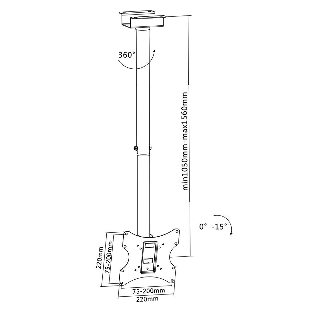 Držák na televize a monitory Fiber Novelty C200 Stropní držák pro zavěšení televizorů a monitorů 23" až 50", nastavení délky 105-156cm, otočný, sklopný, VESA 75x75 až 200x200, nosnost 50kg Kvalitní stropní držák, který je vhodný na menší a středně velké televizory a monitory s úhlopříčkami 23" až 50". Držák poskytuje širokou škálu nastavení - vzdálenost od stropu v rozmezí 105 - 156cm, otáčení do stran a náklon. Montáž je velmi snadná a rychlá, zavěšení televizoru je velmi bezpečné. Držák umožňuje skryté vedení kabeláže vnitřkem nosné konstrukce. Součástí balení je montážní materiál - šrouby, vruty, hmoždinky. Nastavitelná výška stropního držáku na Tv a monitory FN-C200 Technické údaje: maximální zatížení 50kg VESA standard 75x75, 100x100, 200x100, 200x200 doporučujeme na televize a monitory s úhlopříčkou 23" až 50" nastavitelná vzdálenost od stropu 105 - 156cm natočení do stran +360° až -360° náklon 0° až -15° snadná montáž a rychlá montáž systém pro skryté vedení kabeláže výborná kvalita barva černá záruka 5 let Stropní držák na TV Fiber Novelty C200 podporuje VESA standardy: VESA 75x75 VESA 100x100 VESA 200x100 VESA 200x200 Stropní držák na Tv s nastavitelnou délkou, nastavitelným sklonem a vedením kabeláže - Fiber Novelty FN-C200 Držák na stropní zavěšení Tv Fiber Novelty C200 je vhodný pro zavěšení všech televizorů a monitorů, které mají hmotnost do 50kg a podporují některý VESA standard dle tabulky výše. Uváděná doporučená úhlopříčka není podstatná, pouze informativní, jak velké obrazovky by měli být vhodné..