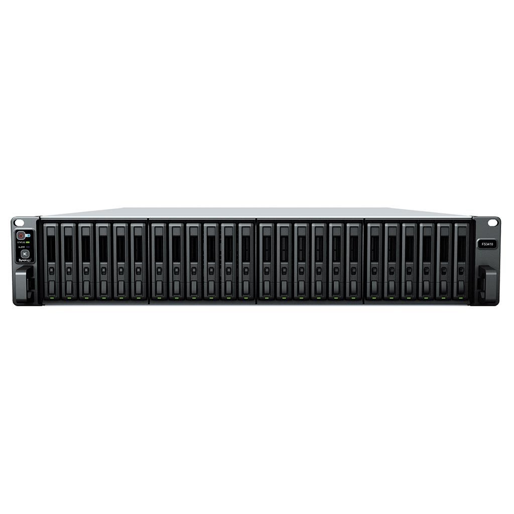 24šachtové zařízení Synology FlashStation FS3410 v pouzdru 2U pro montáž do rackových skříní je ideální pro malé a střední podniky, podnikové kanceláře a datová centra vyžadující stálý vysoký výkon vstupů/výstupů v aplikacích, jako je postprodukce videa, virtuální počítače (VM), podnikové e-mailové servery a online zpracování transakcí.