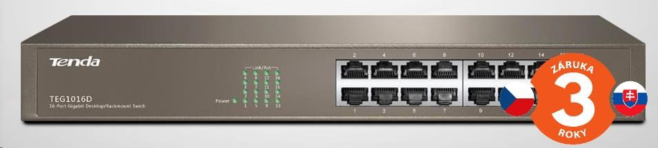 Switch 16x 10/100/1000Mb/s, Auto MDI/MDIX, montáž do racku 19", redukce součástí, 8K MAC adresy, přepínací kapacita 32 Gb/s. Zcela tichý bez ventilátorů. Součástí balení je český, slovenský a polský manuál. Popis produktu - hlavní parametry Standarty&protokoly: IEEE 802.3, IEEE 802.3u, IEEE 802.3x, IEEE 802.3ab Porty: 16x 10/100/1000 Mb/s RJ45 Auto MDI/MDIX Forward. rychlost: 10 Mb/s: 14880pps/port, 100 Mb/s: 148800pps/port, 1000 Mb/s: 1488000 pps/port Celková propustnost: 32 Gb/s Velikost tabulky MAC adresace: 8K, auto aktualizace Mód přepínání: Store-And-Forward Chlazení: Fanless - bez ventilátorů, pasivní Ovládání: bez managementu Montáž do rozvaděče: ano, výška 1U LED Indikace: 16x Linka/Aktivita, 1x Napájení Spotřeba: 13 W Rozměry: 294 mm x 178 mm x 44 mm(L*W*H), výška 1U Pracovní teplota: 0oC ~ 40oC Vlhkost: 10%-90%RH (nekondenzující) Certifikace: FCC/CE/RoHS Jednoduchá instalace Tenda TEG1016D je plně automatizovaná, a není nutné žádné nastavení. Stačí pouze připojit napájení a jednotlivé kabely RJ45, a TEG1016D se o vše postará. Díky funkci Auto MDI/MDIX není nutné ověřovat zdali připojujete křížené nebo nekřížené kabely, automaticky vše nastaví. Tenda TEG1016D přepíná data pomocí 24 portů RJ45 s přenosovou rychlostí 10/100/1000 Mb/s s automatickou detekcí rychlosti. Switch disponuje ochranou proti přepětí 6000 V. Podpora přepojování uzlů v módu Store-and-Forward. Full-duplex kontrola toku 802.3x, half-duplex kontrola toku v režimu Back-Pressure. Maximální propustnost 32 Gb/s. Balení obsahuje kovové "L" držáky pro montáž do rozvaděče. Switch je napájen interním zdrojem. TEG1016D je vhodná jak do menších a středních firem, tak i do domácností. Obsah balení 1x Tenda TEG1016D 1x Stručná instalační příručka (CZ, SK, PL, EN) 2x Kovový "L" držák pro montáž do rozvaděče 1x Elektrická šňůra.