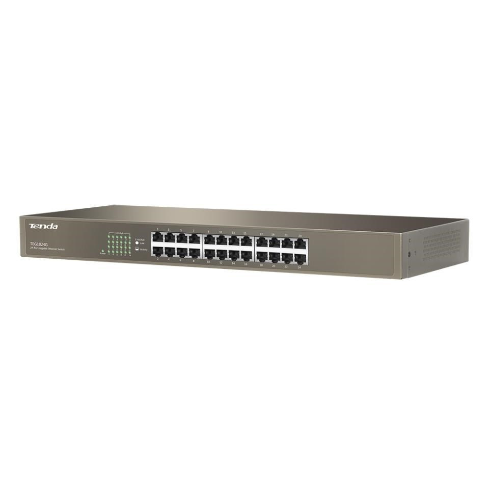 Tenda TEG1024G přepíná data pomocí 24 portů RJ45 s přenosovou rychlostí 10/100/1000 Mb/s s automatickou detekcí rychlosti. Switch disponuje ochranou proti přepětí 6000 V. Podpora přepojování uzlů v módu Store-and-Forward. Full-duplex kontrola toku 802.3x, half-duplex kontrola toku v režimu Back-Pressure. Maximální propustnost 48 Gb/s. Balení obsahuje kovové "L" držáky pro montáž do rozvaděče. Switch je napájen interním zdrojem.