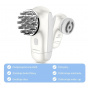 Měkká masážní hlavice používá měkké silikonové výstupky, které jemně masírují pokožku a uvolňují napětí a únavu. Zlepšuje také prokrvení pokožky hlavy. Hrubá masážní hlavice používá tvrdé výstupky, které stimulují spánek, podporují pocit uvolnění, zlepšují krevní obě a pomáhají podpořit zdravý růst vlasů. Kartáčová hlava na čistění obličeje má měkké hedvábné štětiny, které jemně čistí pleť. Sonické vibrace pomáhají štětinám lépe se dostat do pórů a odstranit z pleti nečistoty, přebytečnou mastnotu a zbytky make-upu.