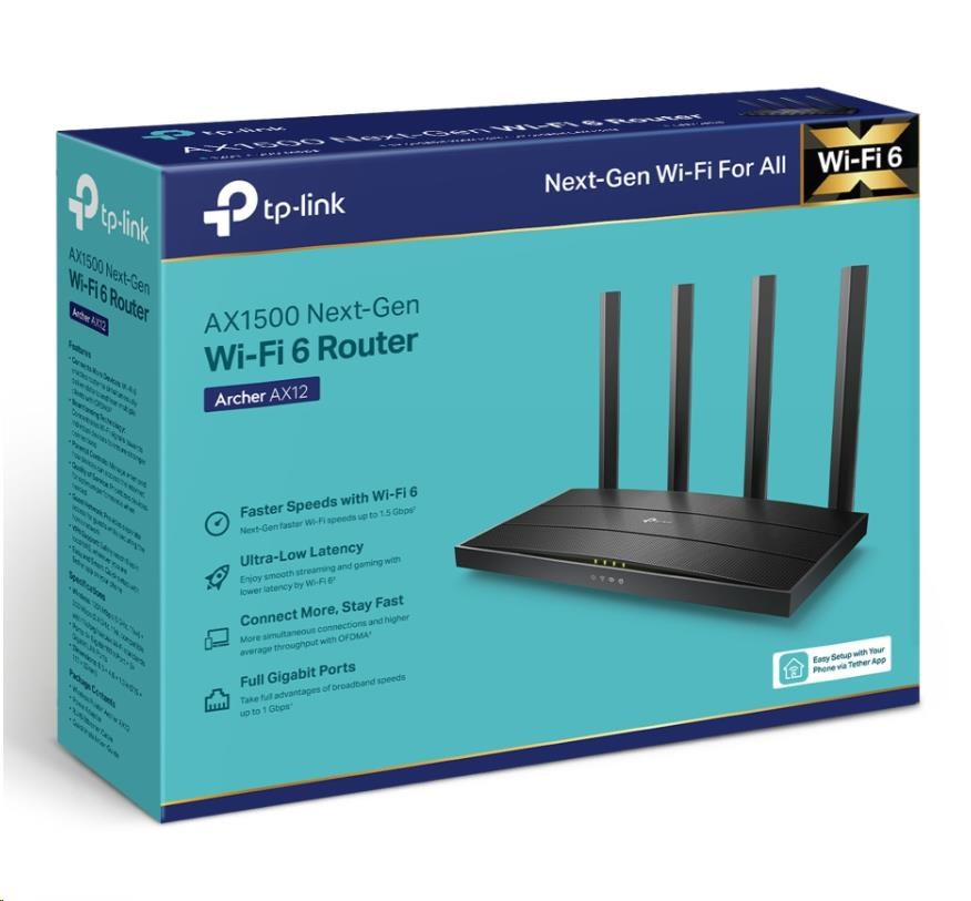 - Technologie Wi-Fi 6: Archer AX12 je vybaven nejnovější bezdrátovou technologií Wi-Fi 6 pro vyšší rychlosti, větší kapacitu a snížené přetížení sítě.