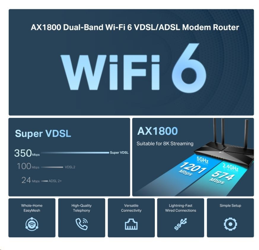 Funkce:Wifi Router, ADSL, ADSL2, ADSL2+, VDSL, VDSL2, MU-MIMO, VPN; Frekvenční pásmo (GHz):2,4, 5; Typ antény:Vestavěná; Gigabit ethernet; Počet portů LAN:4; Přenosová rychlost Wi-Fi (Mb/s):1600 - 2034; Podporované standardy:802.11ax, 802.11b/g, 802.11b/g/n, 802.11a, 802.11b, 802.11g, 802.11a/n, 802.11n, 802.11ac; USB port.