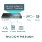Vyhovuje standardu 802.3af/at PoE + a podporuje až 30 W napájení na každém PoE portu. Celkový výkon napájení až 250 W PoE pro 24× PoE porty, umožňuje široké spektrum aplikací, jako je dohled, kanceláře, koleje a malé podniky. Je plně kompatibilní s IP kamerami, přístupovými body, IP telefony, počítači, tiskárnami atd.
