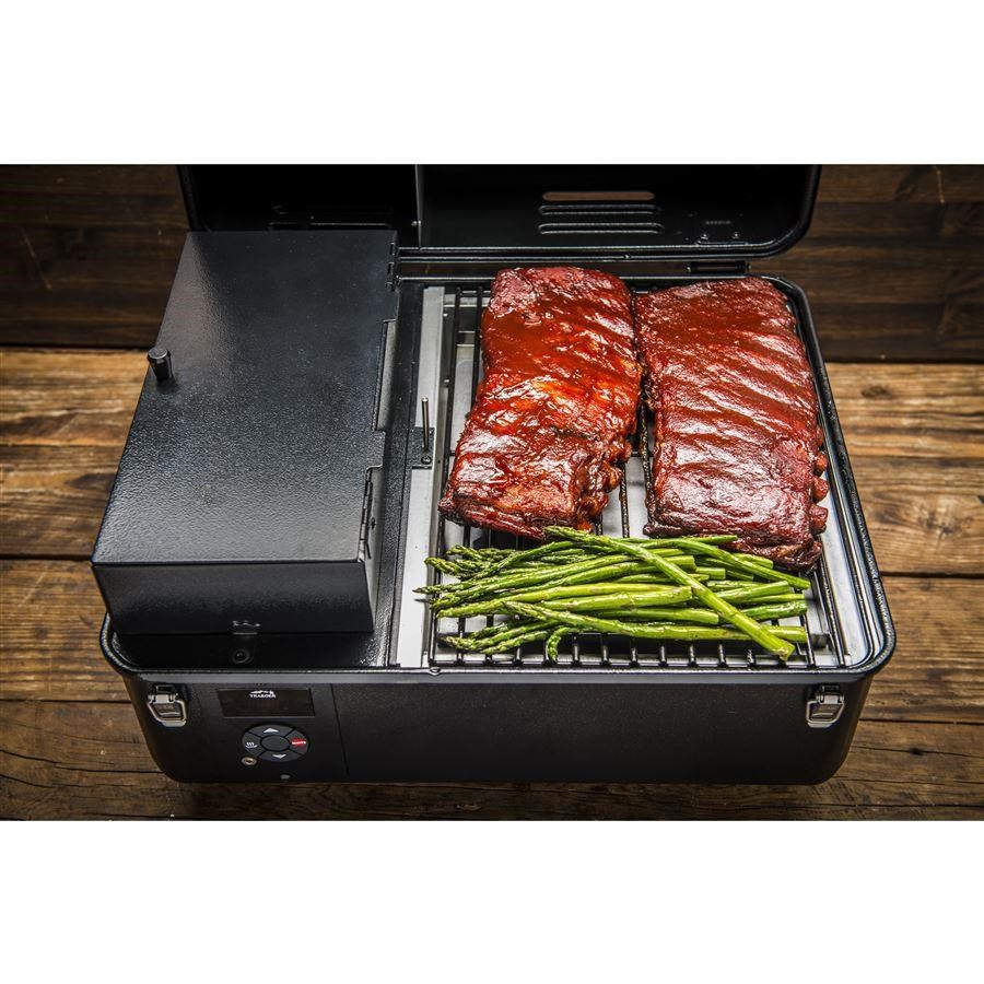 Tento gril na dřevěné pelety je navržen pro maximální všestrannost a pohodlí, ať už grilujete kdekoli. Nabízí široký teplotní rozsah, od nízkého a pomalého "kouření" až po 232 °C (450 °F), což vám umožní kouřit, péct i opékat téměř jakékoli jídlo. S celkovou plochou pro vaření 176 čtverečních palců a litinovou plotnou pro dokonalé opékání budete mít dostatek místa a nástrojů pro přípravu chutných pokrmů. Gril je vybaven snadno čistitelnou ocelovou mřížkou s porcelánovým povrchem a k uvedení do provozu stačí zapojit přiložený 6ft. napájecí kabel do nejbližší zásuvky. Zásobník pojme 8 liber pelet, což zajišťuje dlouhé hodiny grilování bez doplňování. S napětím 120 V AC a výkonem 250 W se můžete spolehnout na rychlé zahřátí a konzistentní regulaci teploty, přestože tento model není vybaven připojením WiFIRE®. Pro usnadnění kontroly vnitřní teploty masa je součástí balení jedna sonda na maso Traeger.