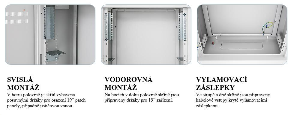 Hybridní domovní rozvaděč SHA - IP20, nosnost 30 kg. Rozvaděč je určen k montáži na omítku (model SHA) SVISLÁ MONTÁŽ V horní polovině je skříň vybavena posuvnými držáky pro osazení 19“ patch panely, případně jističovou vanou. VODOROVNÁ MONTÁŽ Na bocích v dolní polovině skříně jsou připraveny držáky pro 19“ zařízení. VYLAMOVACÍ ZÁSLEPKY Ve stropě a dně skříně jsou připraveny kabelové vstupy kryté vylamovacími záslepkami..