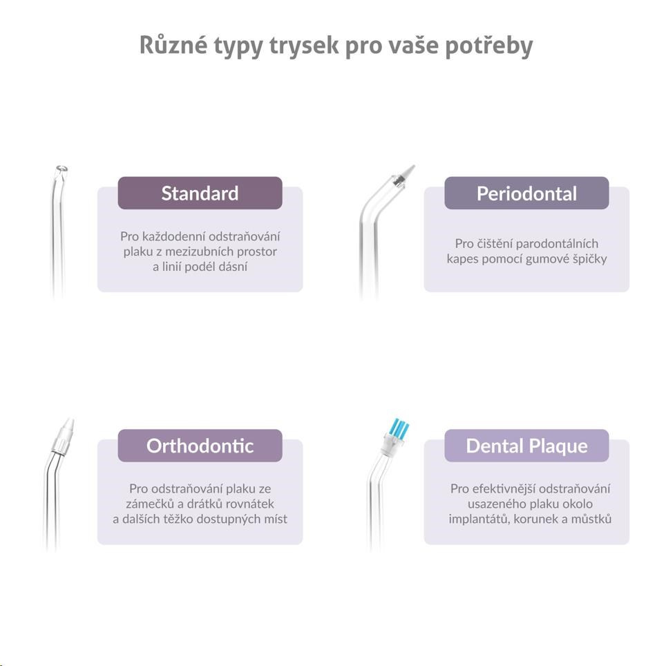 Součástí balení je 6 různých druhů trysek C-series, sprchu tak může využívat celá rodina. Další trysky pro různé dentální potřeby lze případně dokoupit.