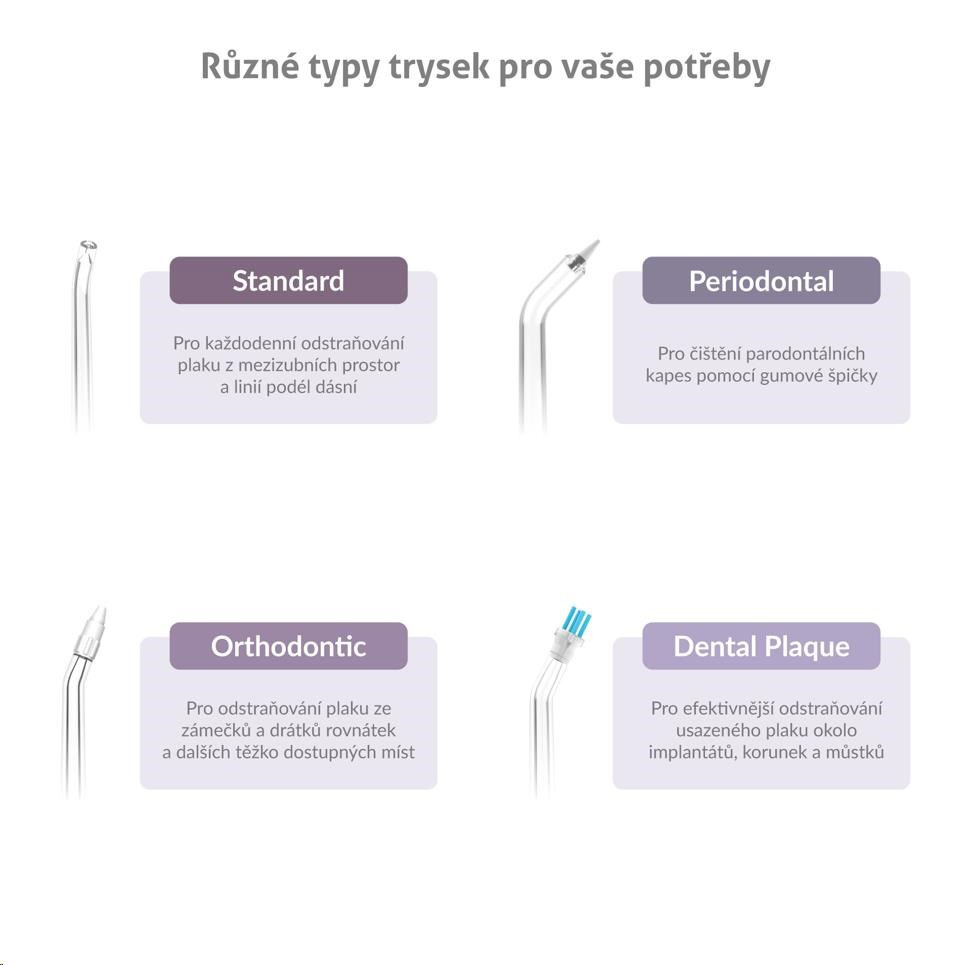Součástí balení je 6 různých druhů trysek C-series, sprchu tak může využívat celá rodina. Další trysky pro různé dentální potřeby lze případně dokoupit.