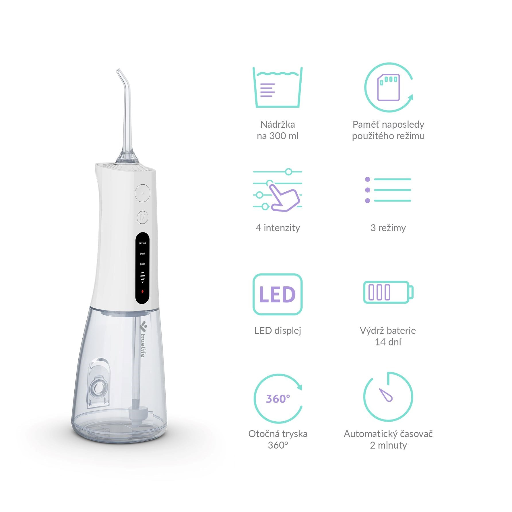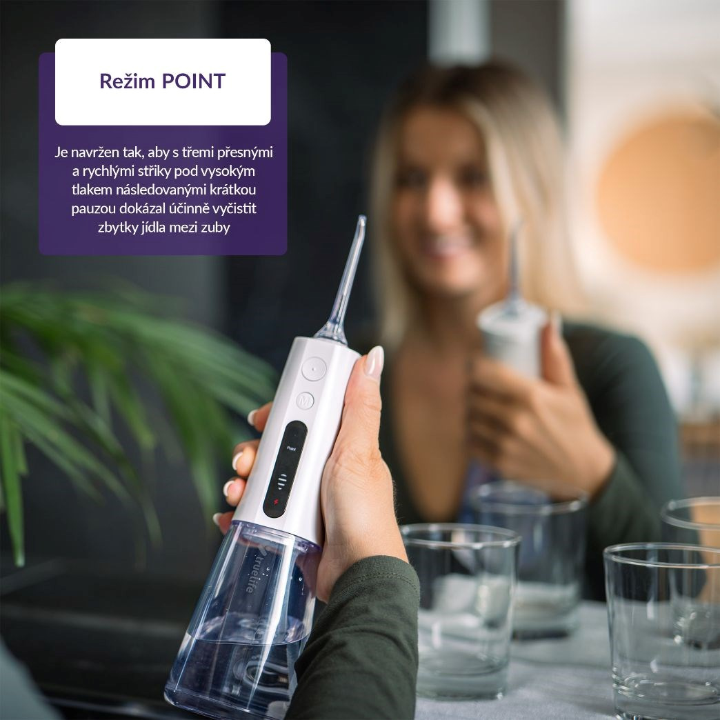 Ústní sprcha TrueLife AquaFloss Compact L100 nabízí mnohem pohodlnější a šetrnější způsob čištění mezizubních prostor než zubní nitě či mezizubní kartáčky. Navíc šetří peníze, protože není třeba tyto komponenty stále dokupovat. 300ml nádržku naplníte shora nebo z boku vodou, zvolíte jeden ze 3 režimů čištění a technologie StreamTrue® se postará o účinné odstranění zubního plaku, bakterií a zbytků jídel, neboť mikrobublinky vytvořené z vody a vzduchu proniknou i do nejužších prostor. Speciální režim POINT cíleně odstraní zbytky jídel třemi přesnými a rychlými střiky pod vysokým tlakem následovanými krátkou pauzou.