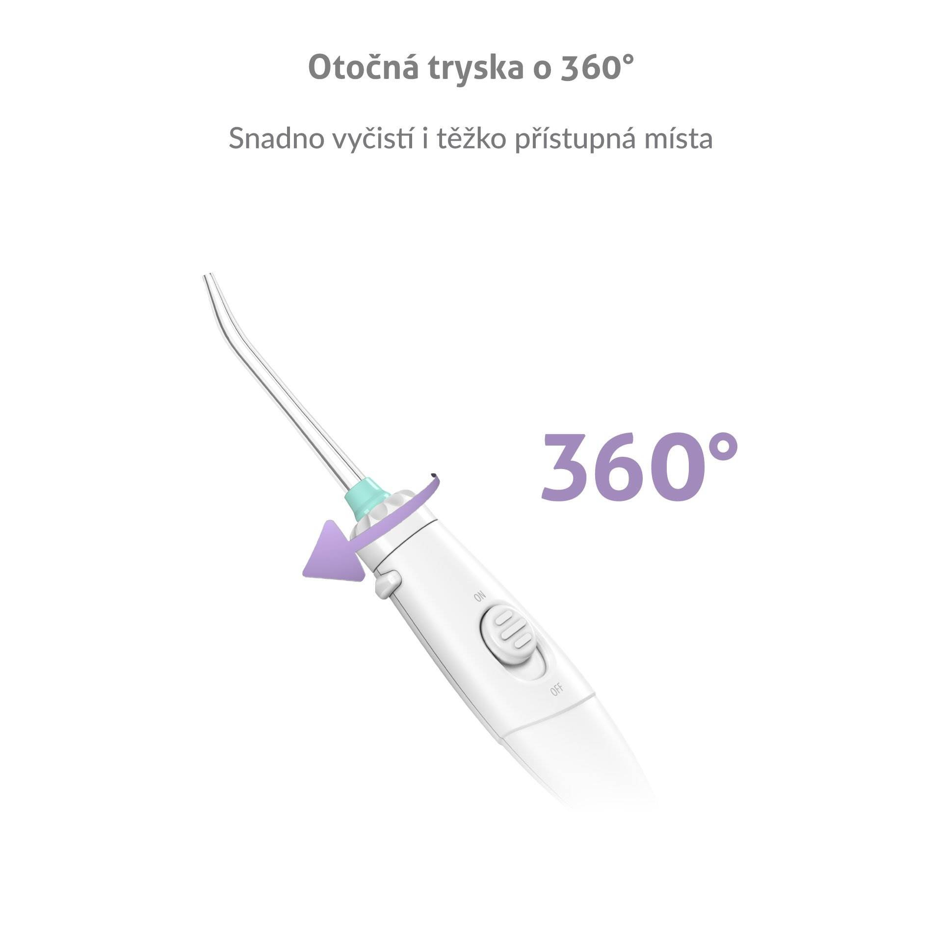 Hlavice trysky je otočná o 360 stupňů, takže snadno vyčistí všechna zákoutí vašich úst.