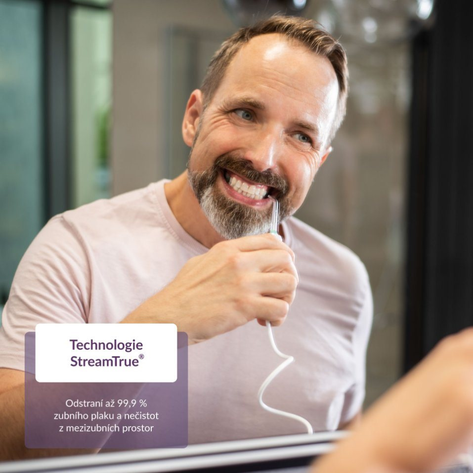 Pravidelné čištění mezizubních prostor by mělo být každodenní součástí vaší dentální rutiny. V dospělosti totiž vzniká až 95 % kazů právě v úzkých mezírkách mezi zuby. Jejich pravidelné čištění navíc pomáhá předejít i zánětu dásní nebo paradentóze. S ústní sprchou TrueLife AquaFloss Station S600 je čištění mezizubních prostor snazší a šetrnější, než při použití mezizubních kartáčků či nití. Díky technologii StreamTrue® zubní sprcha odstraní až 99 % zubního plaku a vyčistí vaše zuby tak, jak to samotný kartáček nikdy nedokáže. Sprcha nabízí 10 tlakových úrovní a 6 speciálních trysek pro různé dentální potřeby.