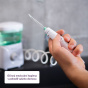 Používání AquaFloss Station S600 je mnohem snazší a šetrnější, než čištění pomocí zubní nitě a mezizubních kartáčků, které navíc musíte pravidelně dokupovat. Stačí naplnit 600ml nádržku sprchy vodou a zapnout čištění. Pomocí StreamTrue® technologie proud vody a vzduchu pronikne i do těch nejužších prostor a účinně odstraní zubní plak, bakterie i zbytky jídla. Ovládání sprchy je snadné, intenzitu tlaku nastavíte na stanici a čištění zapnete / vypnete přímo na rukojeti.
