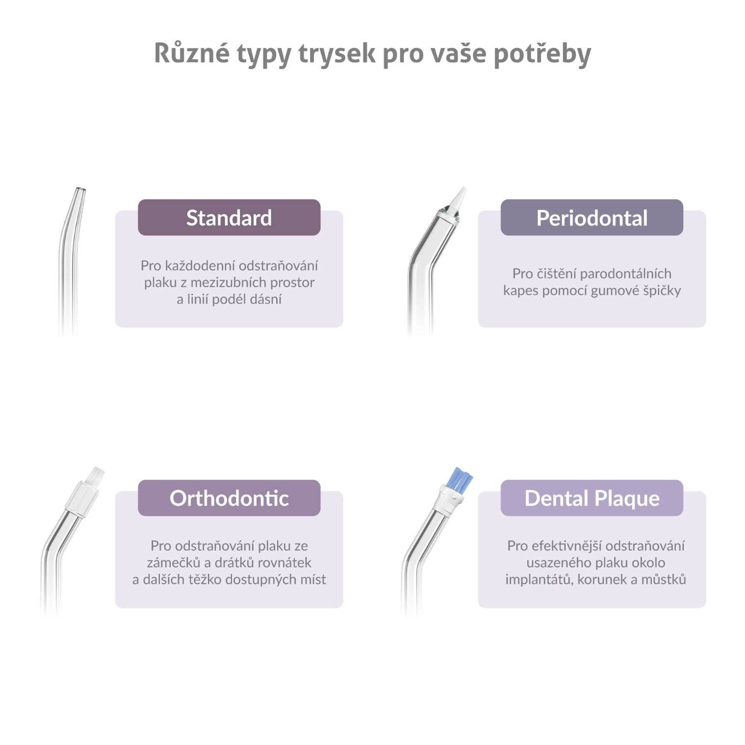 • Orthodontic – Ortodontická tryska pro odstraňování plaku ze zámečků a drátků rovnátek a dalších těžko dostupných míst