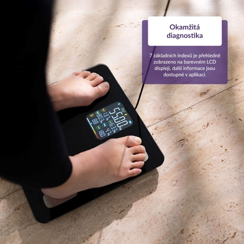 Přehledný LCD displej ukazuje okamžitě 7 tělesných indexů včetně hmotnosti.