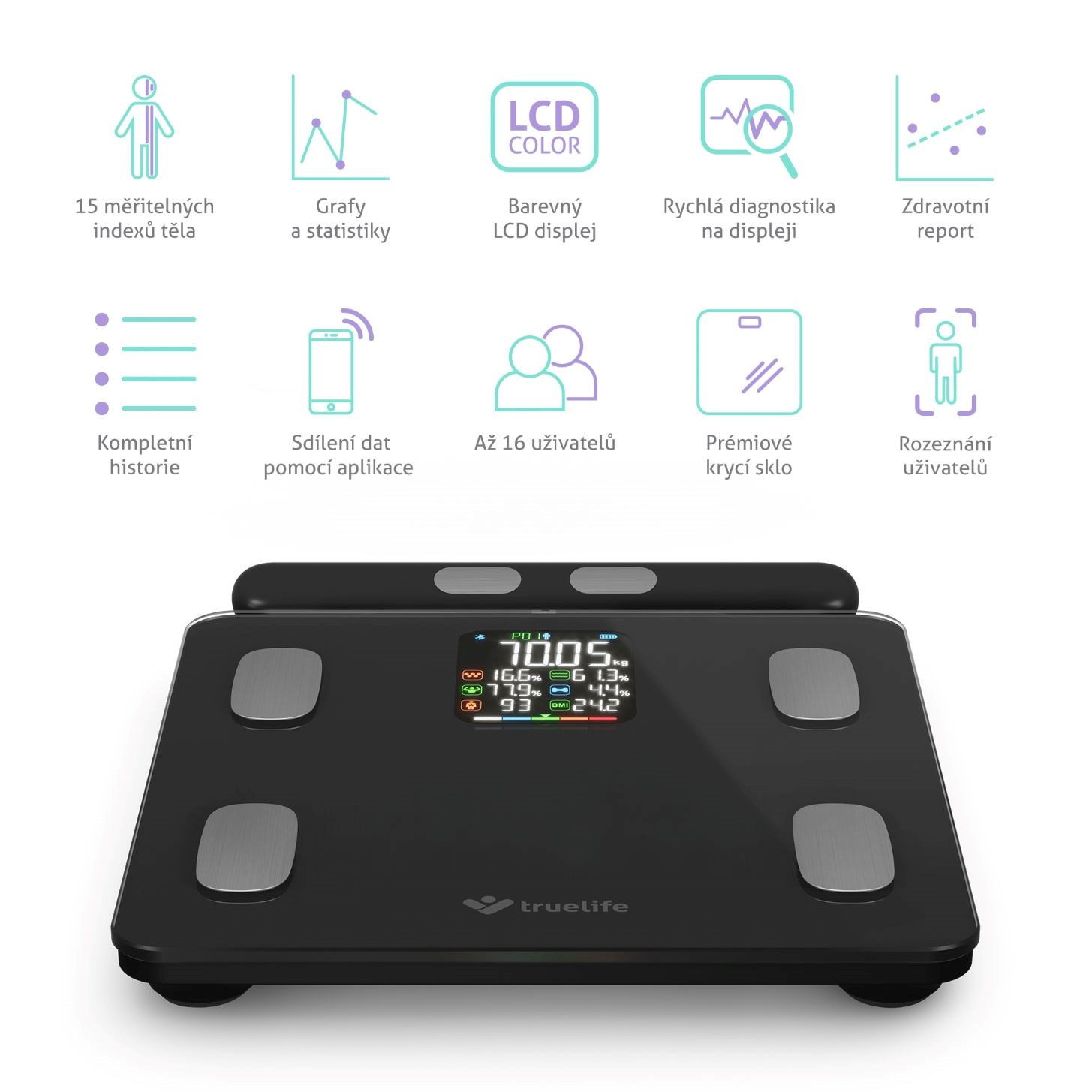 TrueLife FitScale W8 BT Black pomocí Bluetooth snadno propojíte s aplikací, která je kompletně v češtině, přináší řadu výhod a rozšiřuje možnosti osobní váhy. Během vážení se údaje automaticky s aplikací synchronizují, a to až pro 16 uživatelů. Přehledný report pak nabízí 15 indexů těla s detailním vysvětlením a doporučením týkajícím se stravy a cvičení, jak postupovat k vytyčenému cíli. Z 15 posledních měření vytvoří aplikace i grafy a statistiky, aby byl vývoj zřetelnější. Data lze synchronizovat také s aplikacemi Moving life, Apple Health, Google Fit a Fitbit.