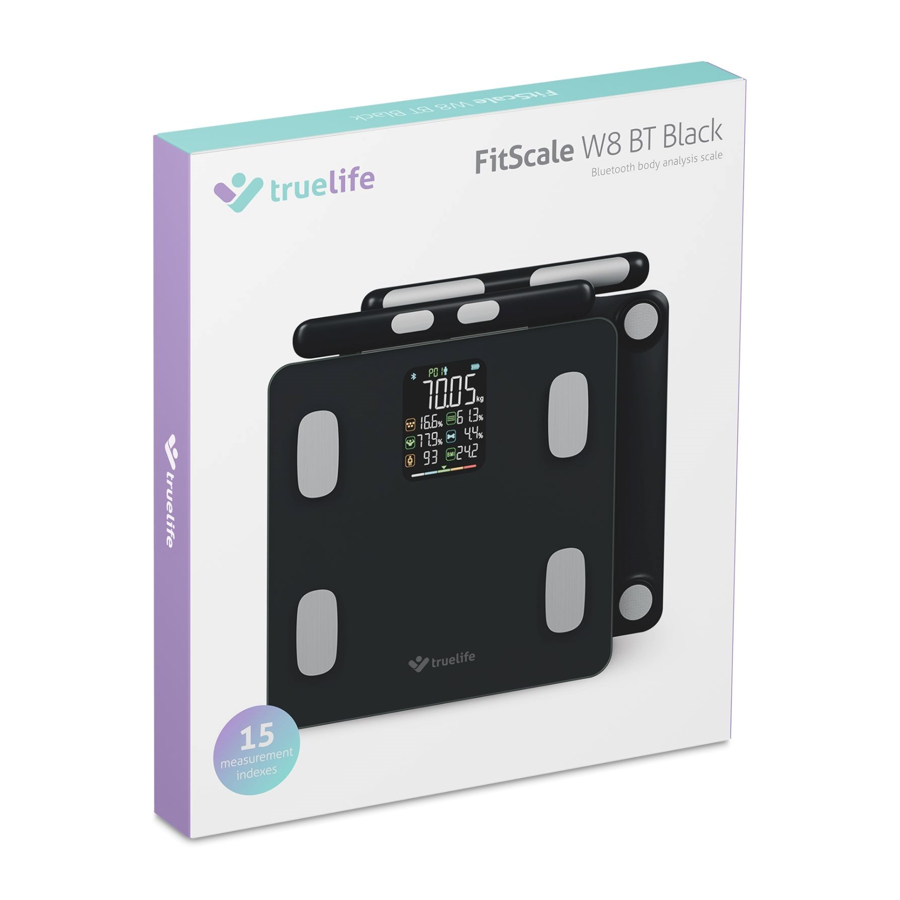 Váha TrueLife Fitscale W8 Black umožňuje díky 8 vysoce citlivým senzorům a technologii TrueLife PrecisionIQ+® měření celého těla – od chodidel po ruce. Váha tak poskytuje komplexní výsledky, které běžné 4-senzorové váhy nedokážou nabídnout. Špičkové senzory doplňují pokročilé algoritmy a inteligentní analýza dat pro přesné a spolehlivé měření. Výsledkem je detailní vyhodnocení struktury těla včetně zdravotních ukazatelů, které je rychlejší a přesnější než u tradičních vah. Bioelektrická impedanční analýza (BIA) vám ukáže poměr svalové hmoty, tuků, vody, kostí na celkové hmotnosti. Na přehledném LCD displeji ihned vidíte 7 indexů těla, aplikace pak nabízí kompletní report s 15 indexy, které jsou zde detailně vysvětleny. Dozvíte se tak například metabolický věk, zastoupení bílkovin a minerálů v těle, BMI či somatotyp.