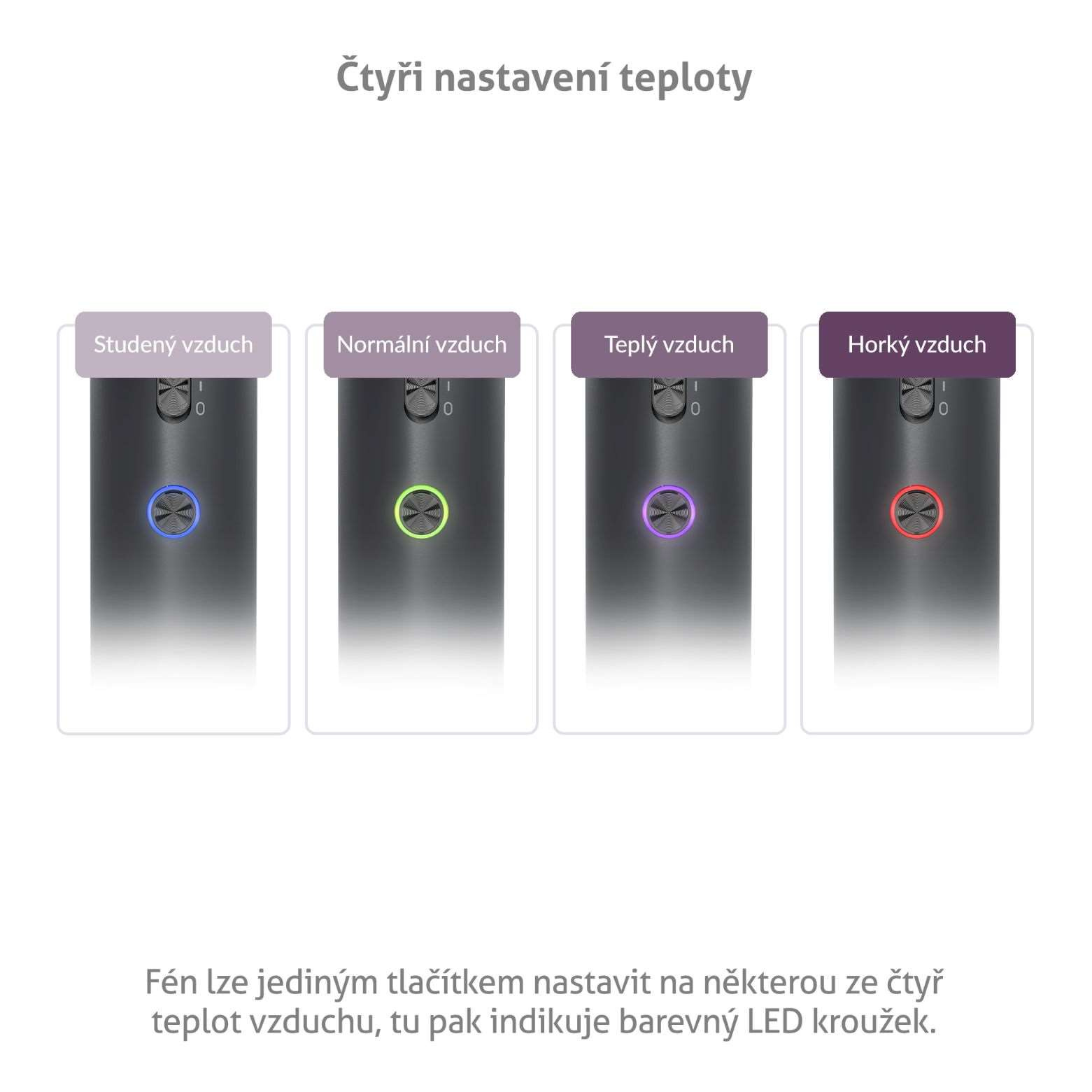 Fén lze jediným tlačítkem nastavit na některou ze čtyř teplot vzduchu – studený, normální, teplý a horký.