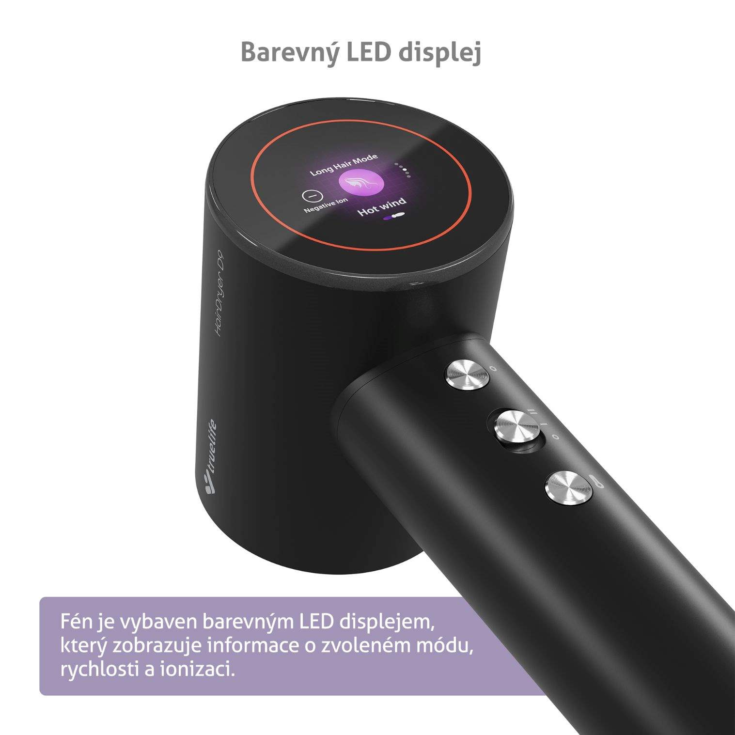 Fén je vybaven kulatým barevným LED displejem, který přehledně zobrazuje informace o fénování – zvolený mód, rychlost a ionizaci.
