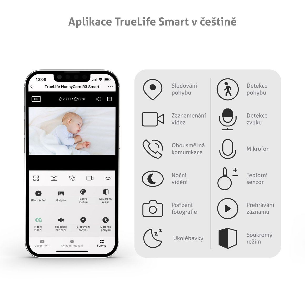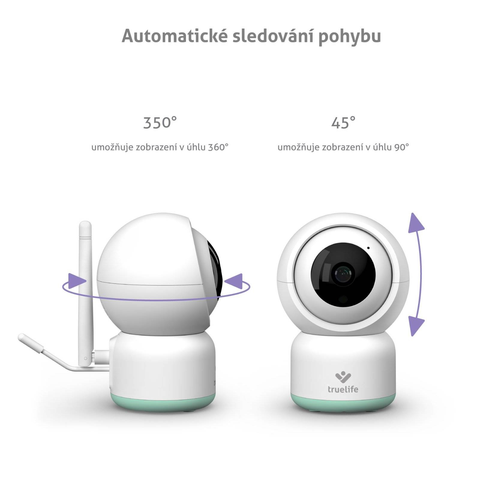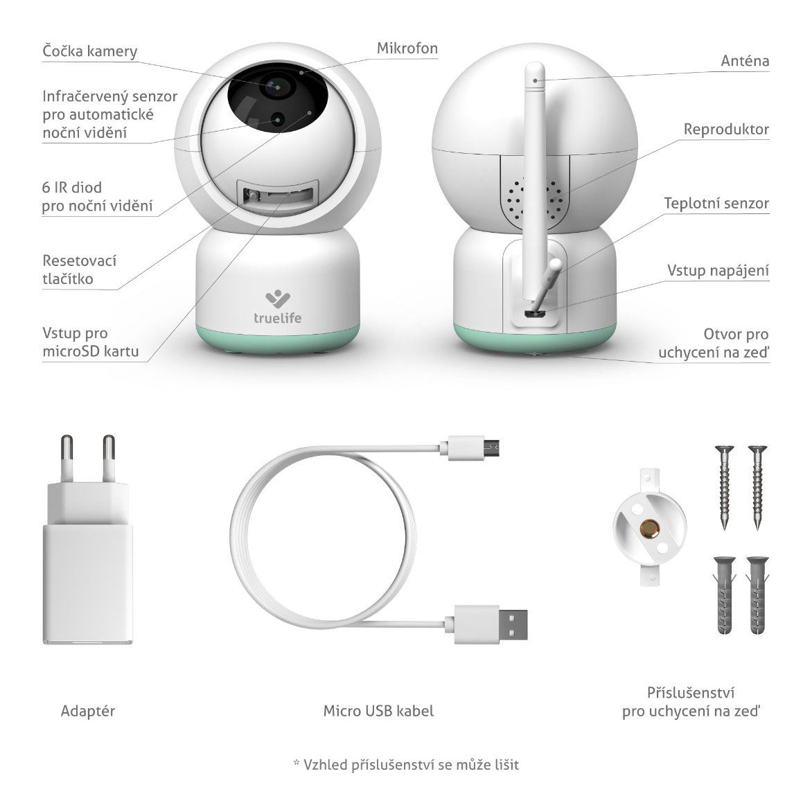 Rotační chůvička s aplikací TrueLife Smart v českém jazyce, neomezený dosah, Full HD video, detekce pohybu, zvuku a teploty, sledování a otáčení za pohybem, automatické noční vidění, obousměrná komunikace, ukolébavky, pořízení fotografií a videí, sdílení účtu s více členy domácnosti, zabezpečení proti hacknutí s pětivrstvou bezpečnostní technologii, nepřetržité nahrávání videa 24/7 na microSD kartu, nastavení hlasitosti, cloudové uložiště.