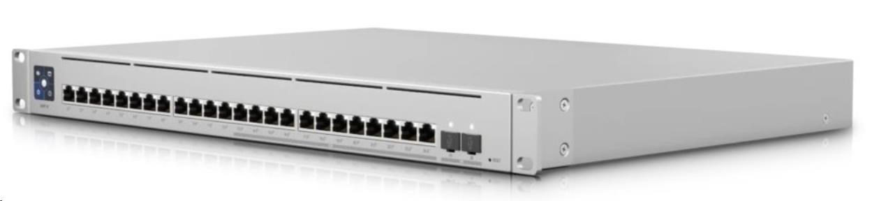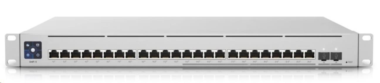 UniFi Switch Enterprise 24 PoE je spolehlivý managovatelný 2.5-Gigabitový L3 Switch s kapacitou přepínání 124 Gbps, (12) 2.5-Gigabit LAN porty, dalšími (12) Gigabit LAN porty a dvěmi SFP+ (10Gbps) šachtami. Všechny ethernetové porty podporují 802.3af/at PoE-Out s výstupním výkonem 30W/port a celkovým PoE Budgetem 400W. Switch má kromě standardní výbavy také 1,3" dotykovým displej pro poskytování informací o systému, teplotě, statistice portů, PoE napájení a mnoho dalšího. Switch lze napájet standardně přes 230V ale také přes UniFi SmartPower RPS, který slouží spíše k zálohování napájení v případě selhání interního zdroje.