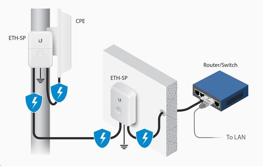 Přestože všechny UBNT jednotky disponují integrovanou ESD ochranou, lze ETH-SP použít jako další vrstvu ochrany, vřele doporučujeme. Šance na poškození vlivem ESD se tím výrazně eliminuje.