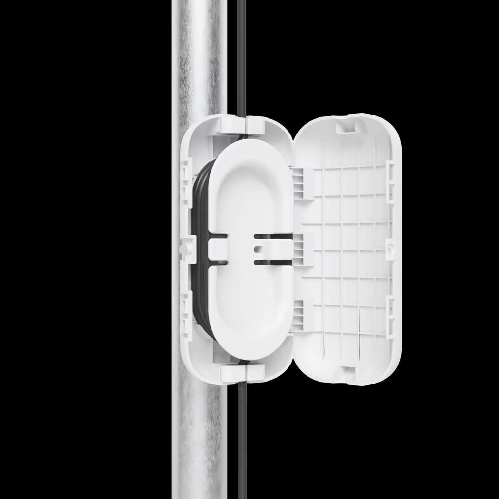 UV-resistant, pole or wall-mountable enclosure with a detachable reel for organizing and reducing physical strain on fiber optic cabling..