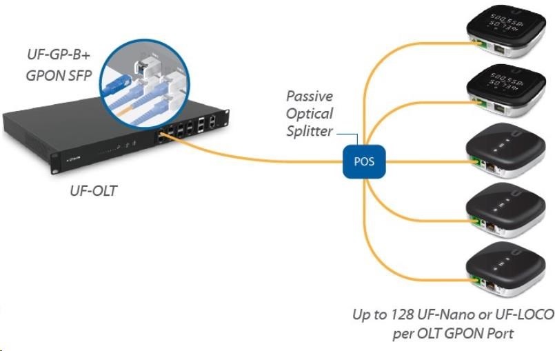 Na 1 GPON port můžete připojit až 128 CPE jednotek na vzdálenost až 20 km. UF-LOCO je kompatibilní s UF-OLT a také s některými OLT jednotkami dalších výrobců.