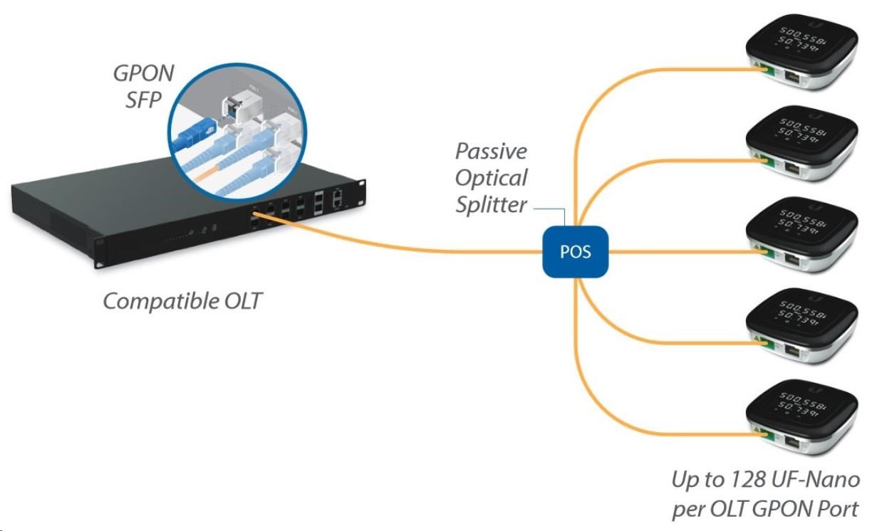 UF-NANO je kompaktní a zároveň robustně stavěný GPON koncový prvek s LED displejem pro zobrazení aktuální propustnosti / IP adresy a stavu ethernetu a optické linky. Rychlost PON linky je maximálně (Rx/Tx) 2.488 / 1.244Gbps, rychlost ethernetu je 10/100/1000Mbps a zařízení jako takové je možné napájet pouze přes 24V pasivní PoE adaptér. Zařízení jako takové slouží k převodu metaliky na optiku a umí pouze mód Bridge, nikoliv mód Router.