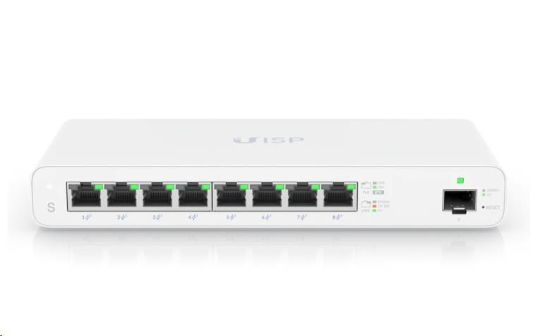 Ideální pro nasazení bezdrátového ISP (WISP), UISP Switch je bezventilátorový, Layer 2 PoE switch s (8) GbE RJ45 porty a (1) 1G SFP portem pro další optickou uplinkovou možnost. UISP Switch je cenově výhodné řešení pro WISP, kteří chtějí svým zákazníkům rychle a levně poskytovat gigabitové bezdrátové rychlosti. Se svým mohutným 110W celkovým napájením PoE poskytuje přepínač UISP značný výkon každému rádiu ve vaší servisní síti. Pro větší nasazení jej spárujte s UISP Console a vytvořte soudržný směrovací a přepínací rozbočovač. Přepínač UISP je spravován POUZE pomocí aplikace UISP, centralizovaná platforma, kde můžete monitorovat a spravovat všechna svá UISP zařízení.