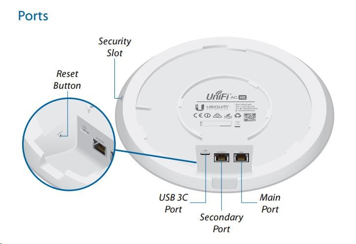 UniFi AP AC HD je první 802.11ac wave2 AP od Ubiquiti s celkovou propustností až 2533Mbps (2.4GHz 800Mbps + 5GHz 1733Mbps), Disponuje 4x4 MU-MIMO všesměrovými dvou-polarizačními dualband. 3dBi antény pro 2.4GHz a 4dBi pro 5GHz s výkonem rádiové části až 25dBm jak pro 2.4 tak i pro 5GHz současně. Podporuje standardy 802.11a/b/g/n/ac/ac wave2, disponuje dvěma gigabit.ethernet. porty (druhý je v bridgi). Lze napájet prostřednictvím aktnivního PoE dle 802.3at případně pasivního (48V DC), PoE adaptér je součástí balení (pasivní). Maximální spotřeba činní 17W.
