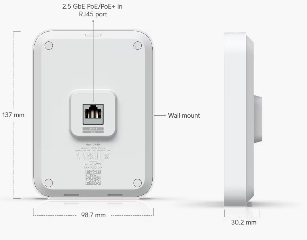 Popis produktu U7-IW je WiFi 7 access point z rodiny UniFi, který je určený k zabudování na krabičku ve zdi. Dual-band WiFi 7 nabízí maximální modulační rychlost až 4,3Gbps v pásmu 5 GHz a až 688Mbps v pásmu 2.4 GHz. Pro připojení k síti má na zadní straně (1) 2.5G ETH port, který slouží i pro napájení jednotky pomocí PoE 802.3af/at či pasivního PoE 42,5 až 57V DC. I po instalaci na krabičku vám zůstanou dostupé (2) 2.5G ETH porty, z nichž jeden podporuje PoE-OUT pro připojení dalšího zařízení. V případě využití PoE-OUT funkce je potřebné jednotku napájet PoE+ 802.3at 30W. Centrální řízení jednotek K zařízení je potřeba stáhnout z oficiálních stránek originální software nazývaný UniFi Network, díky kterému lze řídit celou síť. Nespornou výhodou UniFi Network je, že je zcela zdarma bez jakéhokoliv omezení! Tento centrální management umožní nahrávat mapy a nastavit základní parametry jako například SSID, guest účet, úvodní stránku, statistiky provozu i seznam a status asociovaných klientů vždy snadno a rychle. Výhody UniFi řešení • Roaming - přechod mezi jednotlivými AP bez výpadků • Wireless uplink – ideální pro místa, kam nelze přivést datový kabel • Až 8 SSID • Detailní statistiky provozu • Guest síť • Voucher system • Load balancing - udržování rovnoměné zátěže / přepínání klientů • Omezování rychlosti pro každé SSID Obsah balení • Zařízení • Podložka na přichycení ke zdi • Šroubky Technické parametry Bezdrátové vlastnosti Bezdrátové frekvence:2.4 + 5 GHz (dual band) WiFi standardy:802.11n, 802.11a, 802.11ac, 802.11b/g, 802.11ax, 802.11be MU-MIMO:Ano Přenosová rychlost - 5GHz [Mb/s]:4300 Přenosová rychlost - 2.4GHz [Mb/s]:688 Vysílací výkon 2.4GHz [dBm]:23 Vysílací výkon 5GHz [dBm]:24 Šifrování:WPA, WPA2, WPA3 2.4GHz MIMO:2 x 2 5GHz MIMO:2 x 2 Typ antény:Vestavěná Roaming:Ano Zisk antény [dBi]:4, 8 Konektory a rozhraní Rychlost LAN:(3) 100/1000/2500Mbps Gigabit LAN:Ano Napájení Napájení přes PoE:802.3af, 802.3at, 42 .. 57V DC Typy PoE:PoE-Out + PoE-In Počet PoE Out portů:1 Max. spotřeba energie [W]:13 Fyzické charakteristiky Použití:Vnitřní Tlačítka:Reset Provozní teplota [°C]:-30 až 40 Hmotnost [g]:400 Šířka [mm]:99 Výška [mm]:137 Hloubka [mm]:30 Software Operační mód:Access Point.
