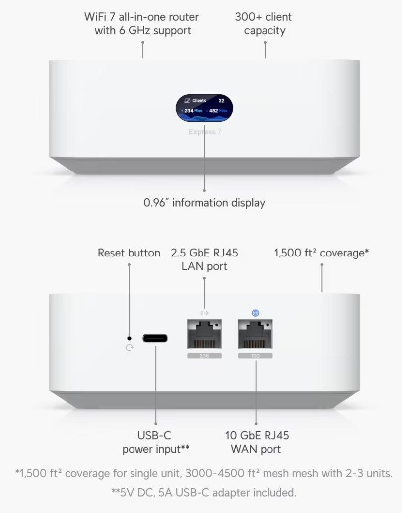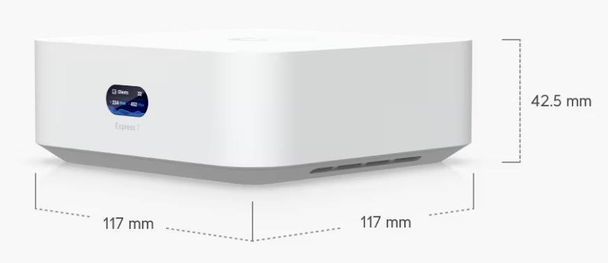 Popis produktu UniFi Express 7 je superkompaktní 10 gigabitová UniFi Cloud Gateway s integrovaným WiFi 7 AP. Pro připojení k síti je vybavena (1) 10Gbps WAN portem a (1) 2.5Gbps LAN portem. Vestavěný Tri-band WiFi 7 AP podporuje nejnovější standard 802.11be s modulační rychlostí až 5,7Gbps v pásmu 6GHz, 4,3Gbps v pásmu 5GHz a 688Mbps v pásmu 2,4GHz s pokročilým šifrováním WPA3. Díky předinstalované aplikaci UniFi Network umožňuje router správu až 30 UniFi zařízení. Kompaktní, ale výkonné provedení zařízení zajišťuje propustnost až 2,3Gbps při aktivním IDS/IPS. Router také podporuje různé typy VPN, včetně site-to-site VPN. Napájení je řešeno přes USB-C 5V/5A, napájecí adaptér je součástí balení. Klíčové vlastnosti • Superkompaktní provedení • Vysoký výkon - propustnost až 2,3Gbps s podporou IDS/IPS • 10G WAN + 2.5G LAN • Vestavěné Tri-band WiFi 7 AP • UniFi Network pro správu až 30 UniFi zařízení • Podpora VPN, včetně site-to-site VPN Obsah balení • Zařízení • Napájecí adaptér • Napájecí kabel • Patch kabel Technické parametry Bezdrátové vlastnosti Bezdrátové frekvence:2.4 + 5 + 6 GHz (triple band) WiFi standardy:802.11n, 802.11a, 802.11ac, 802.11b/g, 802.11ax, 802.11be MU-MIMO:Ano Přenosová rychlost - 5GHz [Mb/s]:4300 Přenosová rychlost - 2.4GHz [Mb/s]:688 Přenosová rychlost - 6GHz [Mb/s]:5700 Vysílací výkon 2.4GHz [dBm]:23 Vysílací výkon 5GHz [dBm]:26 Vysílací výkon 6GHz [dBm]:24 Šifrování:WPA, WPA2, WPA3 2.4GHz MIMO:2 x 2 5GHz MIMO:2 x 2 6GHz MIMO:2 x 2 Typ antény:Vestavěná Roaming:Ano Zisk antény [dBi]:6, 7, 4 Konektory a rozhraní Rychlosti WAN:(1) 100M/1G/2.5G/5G/10G Rychlost LAN:(1) 100/1000/2500Mbps Gigabit LAN:Ano Ostatní:LCD displej Napájení Typ napájení:USB-C Max. spotřeba energie [W]:22 Napájení přes konektor/svorkovnici:5V / 5A Fyzické charakteristiky Provedení:Desktop Použití:Vnitřní Šasi:Plastové Tlačítka:Reset Provozní teplota [°C]:-10 až 40 Hmotnost [g]:422 Šířka [mm]:117 Výška [mm]:43 Hloubka [mm]:117 Hardware CPU:ARM Cortex-A53 Frekvence CPU [MHz]:1500 Počet CPU jader:4 RAM [MB]:3072 Software Podporované VPN:L2TP, IPSec, OpenVPN, WireGuard Předinstalovaný kontroller:UniFi Network Operační mód:AP Router Management:UniFi Network Podpora IPv6:Ano.