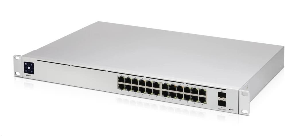 USW-Pro-24 je managovatelný Gigabitový L2 switch s 24x Gigabit LAN porty a dvěma porty SFP+ s přenosovou rychlostí 1/10Gbps. Switch má kromě standardní výbavy také 1,3" dotykovým displej pro poskytování informací o systému, teplotě, statistice portů a mnoho dalšího.