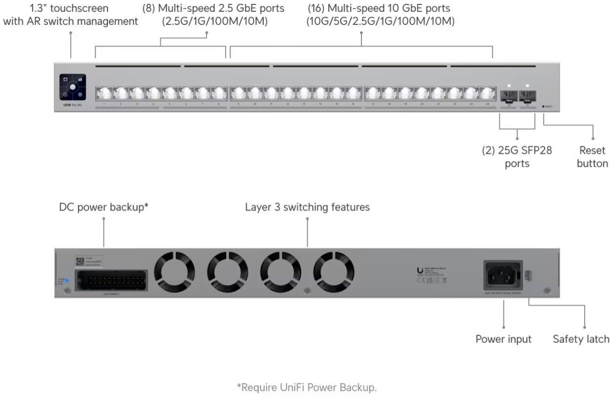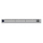 Popis produktu UniFi Switch USW-Pro-XG-24 je managovatelný L3 Switch s kapacitou přepínání 460 Gbps, (16) 2.5-Gigabit LAN, (32) 10-Gigabit LAN porty a (4) SFP28 (25G/10G/1G) porty. Ethernetové porty disponují funkcí Etherlighting, která Vám umožňuje barevně rozsvěcet porty pro zobrazení umístění portu, rychlosti/připojení a VLAN. Switch se napájí ze sítě 230V AC a jako záloha pro případ selhání primárního napájení slouží USP RPS DC port. Maximální spotřeba je 250W. Klíčové vlastnosti • (16) 2.5G portů • (32) 10G portů • (4) 25/10/1G SFP28 porty • Etherlighting - světelné zobrazení informací o portu • Montáž do racku • Správa pomocí UniFi Network Server Správa přes UniFi Network server USW-Pro-XG-24 nemá webový management ale je spravován centrálně pomocí UniFi Network Server s podporou mobilní aplikace UniFi a nabízí rozsáhlou sadu pokročilých přepínacích protokolů a funkcí L2 a L3, včetně provozního režimu (přepínání, zrcadlení nebo agregace) na port. UniFi Network Server a mobilní aplikace umožňují správcům konfigurovat a sledovat prakticky všechny funkce přepínače v grafickém uživatelském rozhraní odkudkoli. Obsah balení • Zařízení • Napájecí kabel • Úchyty do racku Technické parametry Konektory a rozhraní Rychlost LAN:(16) 2.5G/1G/100M/10M + (32) 10G/5G/2.5G/1G/100M/10M Optické rozhraní:(4) 1/10/25Gbps Ostatní:Dotykový displej Napájení Typ napájení:Ze sítě (230V) Redundantní napájení:Ano Max. spotřeba energie [W]:250 Napájení přes konektor/svorkovnici:230V AC Fyzické charakteristiky Provedení:Rackmount Ventilátory:Ano Šasi:Kovové Tlačítka:Reset Provozní teplota [°C]:-5 až 40 Šířka [mm]:442 Výška [mm]:44 Hloubka [mm]:480 Obecné Rychlost přepínání [Gbps]:920 Tabulka MAC adres:128000 Rychlost předávání paketů [Mpps]:684 Software Management:UniFi Network Funkce:VLAN, DHCP snooping, L2, L3 Výchozí IP adresa:192.168.1.20, Dynamická z DHCP Výchozí jméno a heslo:ubnt / ubnt.