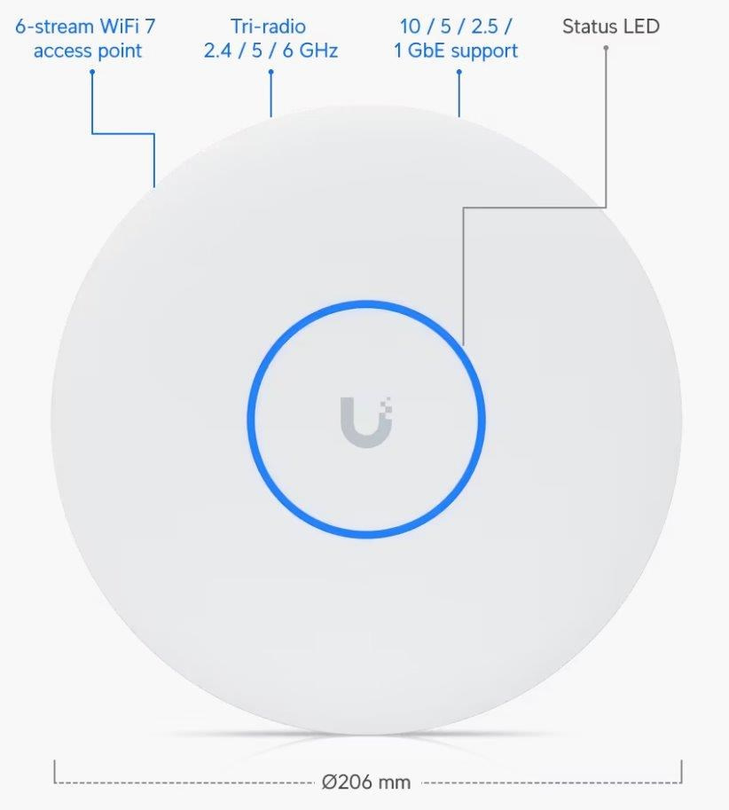 Popis produktu Ubiquiti U7-Pro-XG je nový WiFi 7 UniFi AP. Jedná se o tri-band access point s rychlostí přenosu 5,8Gbps v pásmu 6GHz, až 4,3Gbps v 5GHz pásmu a až 688 Mbps v pásmu 2,4GHz a pokročilým šifrováním WPA3. U7-Pro-XG je určeno k WiFi pokrytí vaší domácnosti, kanceláře, hotelových prostor nebo skladu s podporou až 300+ připojených klientů. Plná podpora roamingu zajišťuje plynulé předávání připojených klientů mezi jednotlivými AP. Pro připojení do sítě je AP vybaveno 10G ETH portem, který slouží i pro napájení pomocí PoE 802.3at nebo pasivním PoE v rozsahu 42,5-57V DC, PoE injektor není součástí balení. Výhody UniFi řešení • Roaming - přechod mezi jednotlivými AP bez výpadků • Wireless uplink – ideální pro místa, kam nelze přivést datový kabel • Až 8 SSID • Detailní statistiky provozu • Guest síť • Load balancing - udržování rovnoměné zátěže / přepínání klientů • Omezování rychlosti pro každé SSID Obsah balení • Zařízení • Kit k přichycení na strop • Sada šroubků Technické parametry Bezdrátové vlastnosti Bezdrátové frekvence:2.4 + 5 + 6 GHz (triple band) WiFi standardy:802.11n, 802.11a, 802.11ac, 802.11b/g, 802.11ax, 802.11be MU-MIMO:Ano Přenosová rychlost - 5GHz [Mb/s]:4300 Přenosová rychlost - 2.4GHz [Mb/s]:688 Přenosová rychlost - 6GHz [Mb/s]:5800 Vysílací výkon 2.4GHz [dBm]:23 Vysílací výkon 5GHz [dBm]:26 Vysílací výkon 6GHz [dBm]:24 Šifrování:WPA, WPA2, WPA3 2.4GHz MIMO:2 x 2 5GHz MIMO:2 x 2 6GHz MIMO:2 x 2 Typ antény:Vestavěná Počet vestavěných antén:6 Roaming:Ano Zisk antény [dBi]:6, 4, 5 Konektory a rozhraní Rychlost LAN:(1) 100M/1G/2.5G/5G/10G Gigabit LAN:Ano Napájení Napájení přes PoE:802.3at, 42 .. 57V DC Typy PoE:PoE-In (pouze) Max. spotřeba energie [W]:22 Fyzické charakteristiky Použití:Vnitřní Tlačítka:Reset Provozní teplota [°C]:-30 až 40 Hmotnost [g]:750 Šířka [mm]:206 Výška [mm]:206 Hloubka [mm]:33 Software Operační mód:Access Point Výchozí IP adresa:192.168.1.20, Dynamická z DHCP.