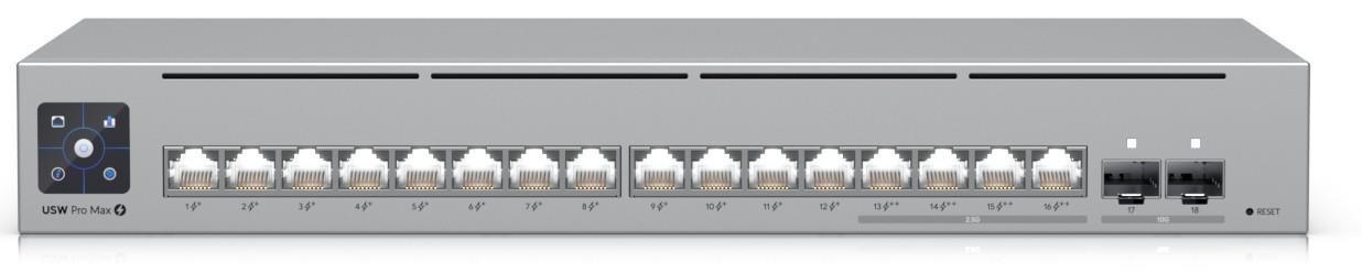 Popis produktu Ubiquiti Pro Max 16-PoE je novým L3 switchem, který nabízí 4x 2.5 Gbps porty s PoE++ až 60W a 12x 1 Gbps porty s PoE+. Celkový PoE budget je 180 W. Pro připojení pomocí optického rozhraní jsou připraveny 2 SFP+ porty dosahující rychlosti až 10 Gb/s. Switch je napájen DC adaptérem 54V DC 210W. Upozornění:pro montáž do racku je nutné dokoupit příslušenství Ubiquiti Pro Max 16 Rack Mount. Etherlighting technologie Switch podporuje technologii Etherlighting, která umožňuje barevně indikovat lokaci portu, linkovou rychlost, nadefinované typy zařízení, PoE status nebo barevně odlišit jednotlivé VLAN. Správa přes UniFi Controller Switch nemá webový management, ale je spravován centrálně pomocí UniFi Controlleru s podporou mobilní aplikace UniFi a nabízí rozsáhlou sadu pokročilých přepínacích protokolů a funkcí L2, včetně provozního režimu (přepínání, zrcadlení nebo agregace) na port. UniFi Network Controller a mobilní aplikace umožňují správcům konfigurovat a sledovat prakticky všechny funkce přepínače v grafickém uživatelském rozhraní odkudkoli. Obsah balení • Zařízení • Napájecí DC adaptér • Montážní set Technické parametry Konektory a rozhraní Rychlost LAN:(12) 10/100/1000Mbps + (4) 10/100/2500Mbps Optické rozhraní:(2) 1G/10Gbps Ostatní:Dotykový displej Napájení Typ napájení:DC konektor Typy PoE:PoE-Out (pouze) Podporované PoE-Out standardy:802.3af, 802.3at, 802.3at - ultra PoE (60W) Počet PoE Out portů:16 PoE budget [W]:180 Max. spotřeba energie [W]:210 Napájení přes konektor/svorkovnici:54V DC Fyzické charakteristiky Provedení:Na zeď, Desktop, Rackmount Ventilátory:Ne Šasi:Kovové Tlačítka:Reset Provozní teplota [°C]:-5 až 40 Šířka [mm]:325 Výška [mm]:44 Hloubka [mm]:160 Obecné Rychlost přepínání [Gbps]:84 Rychlost předávání paketů [Mpps]:62 Software Management:UniFi Network Funkce:VLAN, DHCP snooping, L3 Výchozí IP adresa:Dynamická z DHCP.