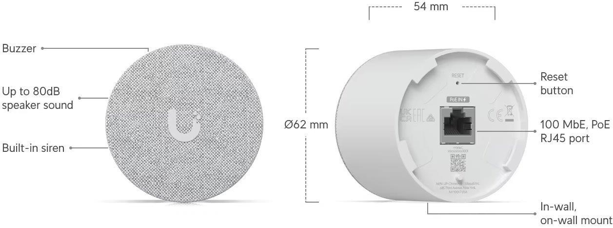 Popis produktu UVC-G4 Doorbell Pro PoE Kit je sada vnitřního zvonku a venkovního tlačítkového videozvonku s přenosem dat pouze po ethernetu. Venkovní jednotka je vybavena přední primární 5MP kamerou a spodní sekundární 8MP kamerou na zobrazení toho, co se nachází na rohožce přede dveřmi. Hlavní kamera domovního zvonku je vybavena IR LED pro poskytování lepšího nočního vidění, které v kombinaci se spodním osvětlením zajišťuje spolehlivě jasné sledování po celý den. Zvonek je také vybaven funkcí potlačení ozvěny a obousměrným audiem pro komunikaci s návštěvníky. Navíc má programovatelný displej, který umožňuje dávat upozornění nebo pokyny k doručení kurýrům. Sada je navržená jako výkonný plug-and-play bezpečnostní nástroj a lze jej nastavit a nakonfigurovat během několika minut pomocí aplikace UniFi Protect. Klíčové vlastnosti Obě kamery mají stream 1080p HD při 30 fps Gigabit LAN s 802.3af PoE (1) 5MP hlavní kamera s IR osvětlením [1600x1200 (2MP), 30 fps] (1) 8MP spodní kamera bez IR [1600x1200 (2MP), 2 fps] Obousměrné audio s potlačením ozvěny Vestavěné verandové světlo, které osvětlí objekty až do vzdálenosti 2 metrů Senzor pohybu Stupeň krytí IPX4, kryt odolný proti povětrnostním vlivům Programovatelný displej Snadné nastavení pomocí aplikace UniFi Protect Obsah balení Zařízení (venkovní jednotka) Zařízení (vnitřní jednotka) (5) Montážní držák Příchytový materiál Technické parametry Kamera Přísvit:IR Dosah přísvitu [m]:2 Pozorovací úhel [°]:138 Obraz Rozlišení:5MP Max. rozlišení [pixely]:1600 x 1200 (UXGA) Konektory a rozhraní Audio:Mikrofon, Reproduktor Ostatní:LCD displej Napájení Napájení přes PoE:802.3af, 37 .. 57V DC Typ napájení:PoE Max. spotřeba energie [W]:7 Fyzické charakteristiky Stupeň krytí:IPX4 Provozní teplota [°C]:-30 až 40 Hmotnost [g]:264 Šířka [mm]:52 Výška [mm]:161 Hloubka [mm]:35.