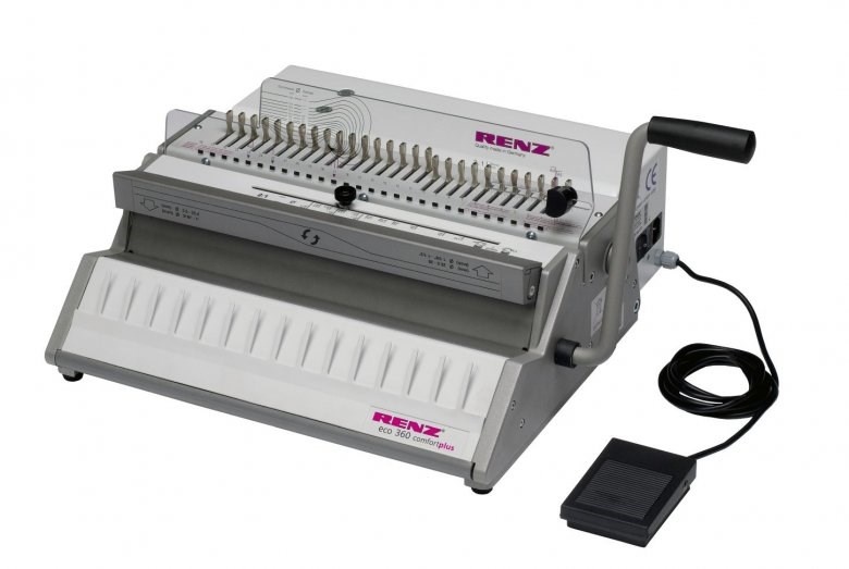 Pracovní šířka 360 mm, rozteč ok 2/1", děrovací kapacita 25 listů 80g papíru, rozměr děr 5,5×3,5 mm, max. rozměr hřbetu 38 mm, vyřaditelné nože, pohon děrování elektrický.