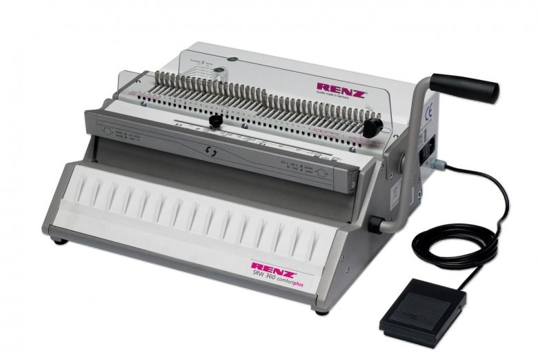 Pracovní šířka 360 mm, rozteč ok 3/1", děrovací kapacita 22 listů 80g papíru, rozměr děr 4×4 mm, max. rozměr hřbetu 16 mm, vyřaditelné nože, pohon děrování elektrický.
