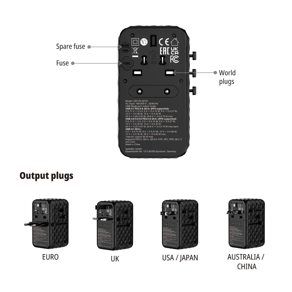 Kompaktní a výkonný univerzální cestovní adaptér Verbatim Charge 'n' Travel GaN III umožňuje nabíjet pět zařízení současně prostřednictvím síťové zásuvky, tří portů USB-C, portu USB-A a výsuvného kabelu USB-C, přičemž nabízí celkový výkon 85 W. Dost na to, abyste mohli bez námahy nabíjet telefony, tablety a další zařízení.