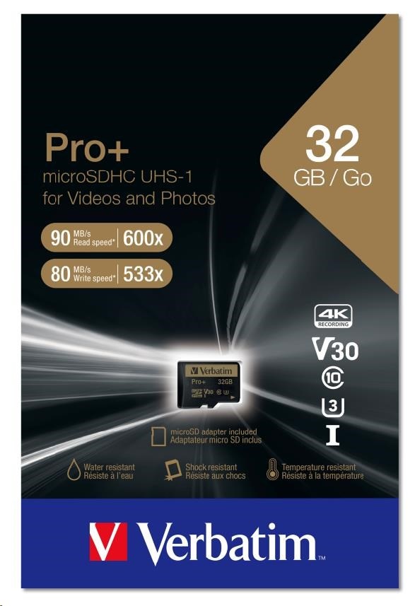Verbatim Pro+ microSD memory Cards are water resistant & shock resistant.