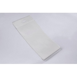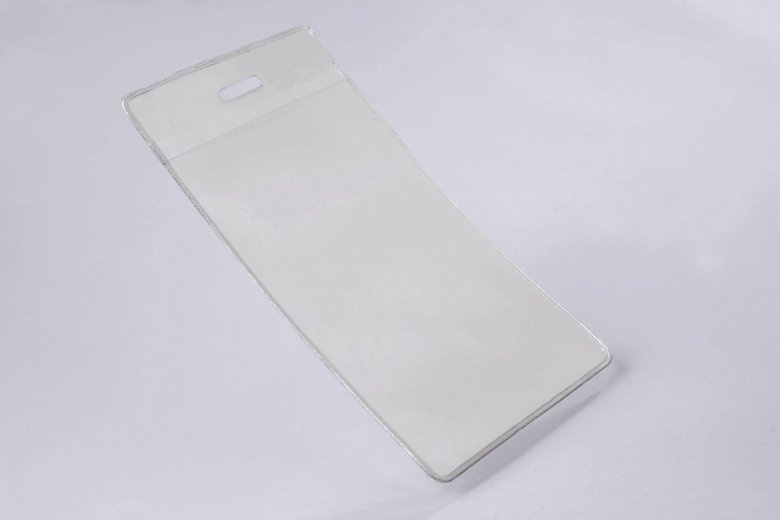 Čirá visačka z měkčeného PVC – svislá, vnitřní rozměr 58×90 mm. Možno zavěsit na klips, šňůrku nebo řetízek..