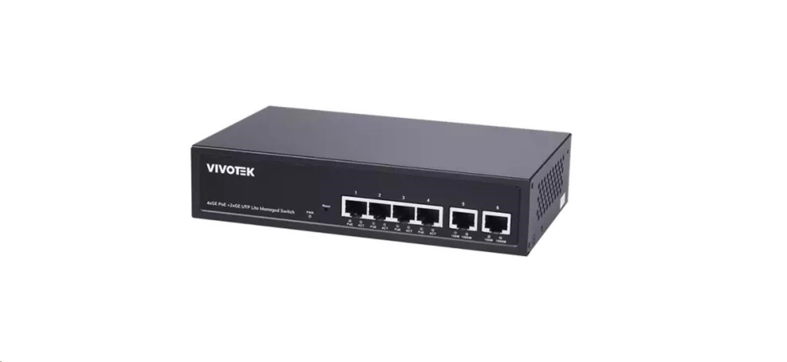 Vivotek PoE switch AW-GEL-065A-060, 4xGE PoE(802.3af/at, PoE budget 60W), 2xGbE RJ-45, extend-mode až 250m(PoE@10Mbps)