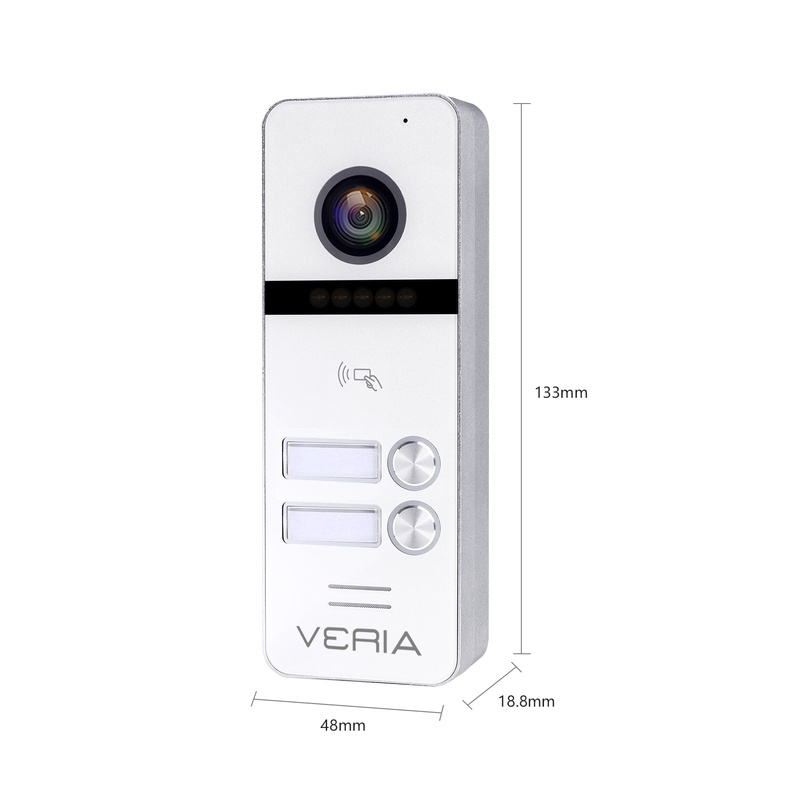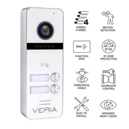 Vstupní kamerova jednotka VERIA 302 je vhodná k propojení s monitory VERIA řady 3xxx. Kamerová jednotka snímá obraz ve Full HD rozlišení, pro noční přísvit používá IR LED diody a pro kvalitní obraz IR Cut filtr. Vstupní stanice disponuje vestavěnou čtečkou RFID čipů 13,56 MHz. Propojení mezi monitorem a vstupní stanicí je 4-vodičové.