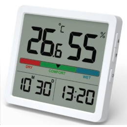 - Velký displej: Jasný a snadno čitelný LCD displej zobrazuje teplotu, vlhkost, čas a datum současně.