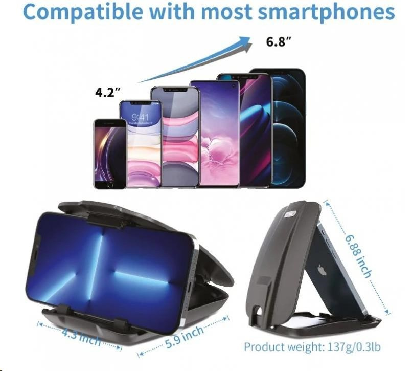 Tento držák spolehlivě udrží váš mobil nebo GPS navigaci na svém místě. Určen je pro instalaci na palubní desku pomocí gelové nano podložky a 3M lepící pásky. Držák vyniká minimalistickým provedením, takže vám nebude v autě nijak překážet. Navíc nabízí ohromnou stabilitu, a tak se skvěle hodí i do náročnějšího terénu. Telefon přitom nemá šanci z držáku vypadnout, čemuž napovídá i fakt, že disponuje protiskluzovým uchycením a samosvorným zavíráním. Přístroj si navíc můžete natočit, jak vám to bude vyhovovat, tedy vodorovně i svisle..