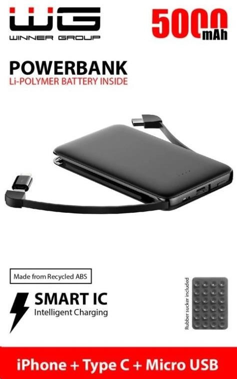 WG - Power Bank 5000 mAh, kabel Micro USB + Type-C + adaptér Lightning, černá