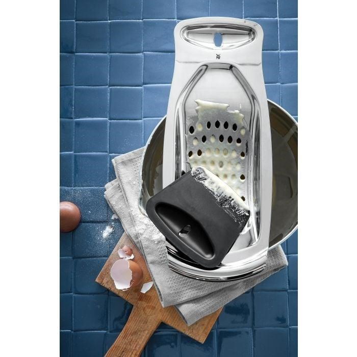 Vychutnejte si lahodné domácí špecle připravené během okamžiku s výrobníkem WMF Spaetzle Maker. Jeho ergonomický design a speciální flexibilní stěrka slibují snadné použití a rovnoměrně tvarované spaetzle během okamžiku. Deska na spaetzle je vybavena širokou rukojetí, která nabízí bezpečné držení, a podpůrnou mřížkou, která se dokonale přizpůsobí hrncům, je vyrobena z nerezové oceli Cromargan® 18/10 a může se pochlubit elegantním, leštěným povrchem, který nikdy nezklame. Je také vhodné pro mytí v myčce nádobí, aby se snadno čistilo. Když se nepoužívá, lze lopatku pohodlně připnout k rukojeti, aby se zabránilo jejímu ztrátě - pro chytré a snadné skladování.